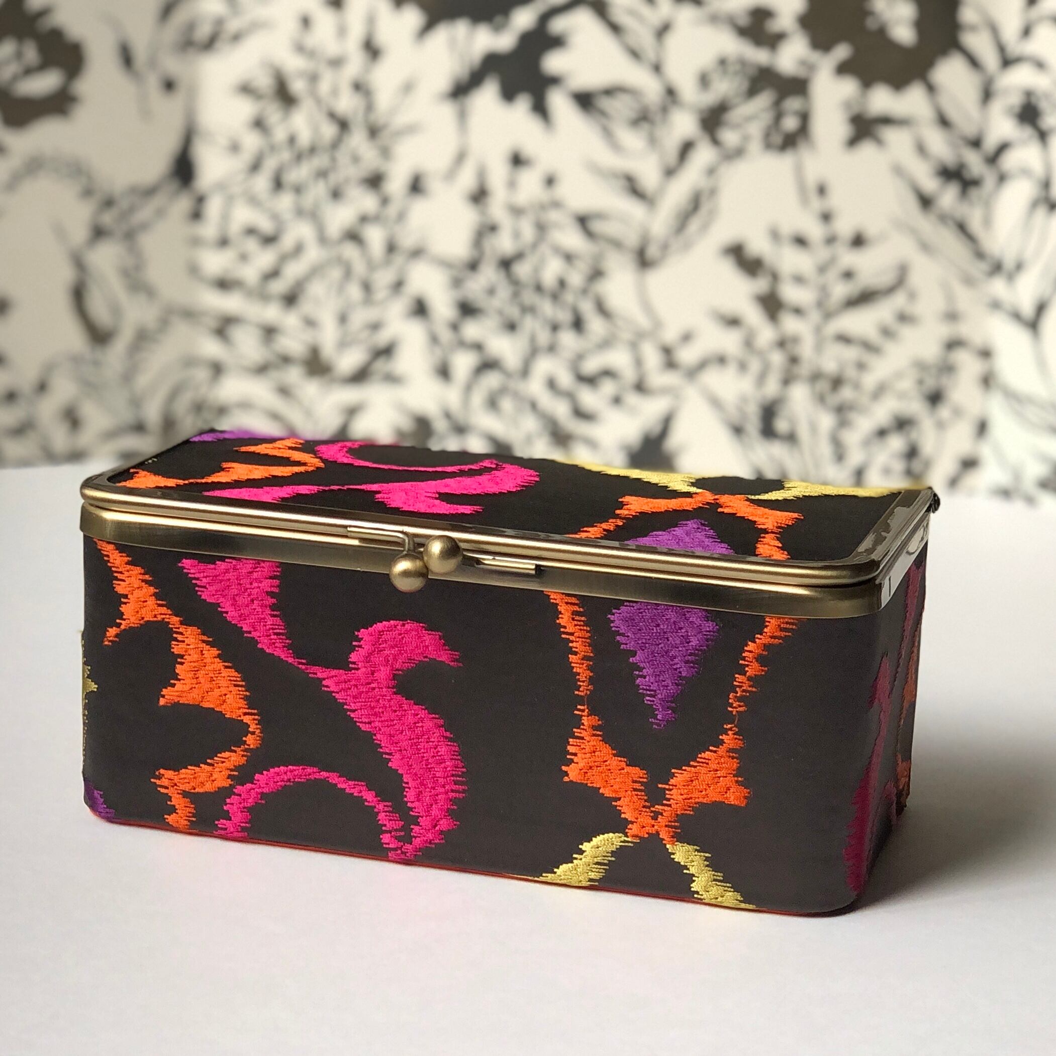 ビビットな刺繍が印象的なフランスのインテリアファブリックを使って作りましたがま口のBOXです。